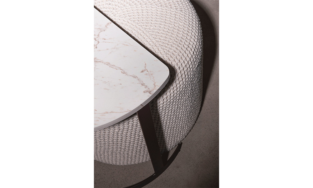 Possui capa de crochê opcional, além de mesa de apoio com estrutura em metal e base em madeira laminada.